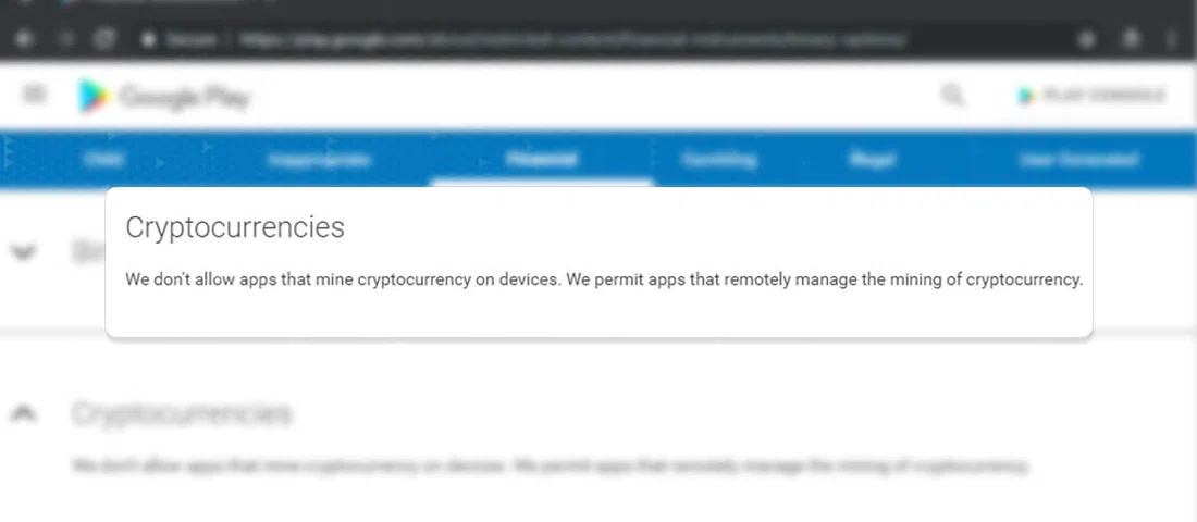 در بهروزرسانی جدید سیاست فروشگاه برنامههای اندروید شرکت گوگل (Google Play Store)، جملهای با مضمون «غیرمجاز بودن برنامههای استخراج کننده ارزهای دیجیتالی» اضافه شده است. این تغییر به این معناست که شرکت گوگل همه برنامههایی که از CPU یا GPU دستگاه برای استخراج ارز دیجیتالی استفاده میکنند را از فروشگاه خود حذف خواهد کرد.