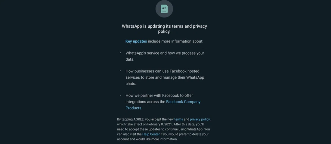 در هفتههای گذشته شرکت واتساپ اطلاعیهای را به منظور پذیرش شرایط جدید حریم خصوصی این پیامرسان معرفی کرده بود که قرار بود در تاریخ ۸ فوریه به اجرا درآید؛ کاربران در مواجهه با این سیاست واتساپ، یا باید شرایط جدید حریم خصوصی این پیامرسان را تایید میکردند یا اینکه با رد آن، امکان استفاده از آن را از دست میدادند.